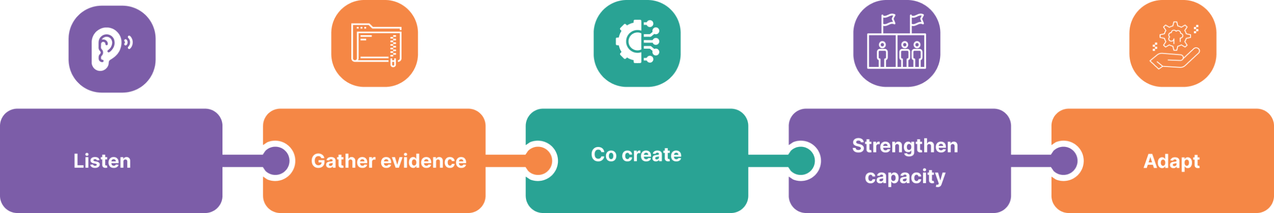 Our strength lies in how we work. We believe lasting change comes from co- creation with partners, not from top-down solutions. The illustration below shows the five core elements of our approach: